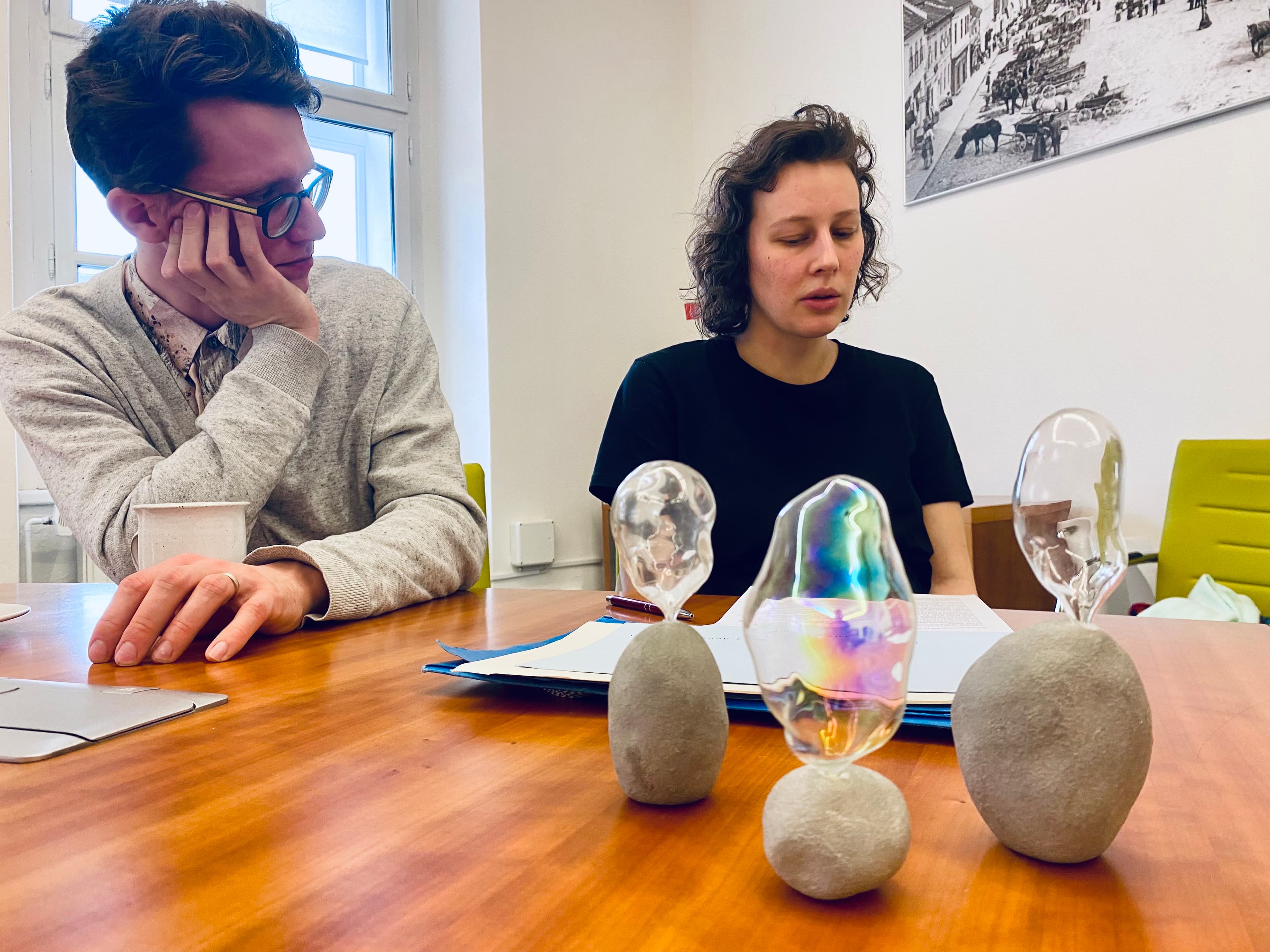Na tomto základě návrh vznikal a dále autorka řešila hlavně konkrétní technické aspekty. Po konzultacích vznikaly návrhy, jak sklo uchytit, nakonec vznikly kamenné podstavce, které vychází ze stejného tvarosloví organické bubliny.